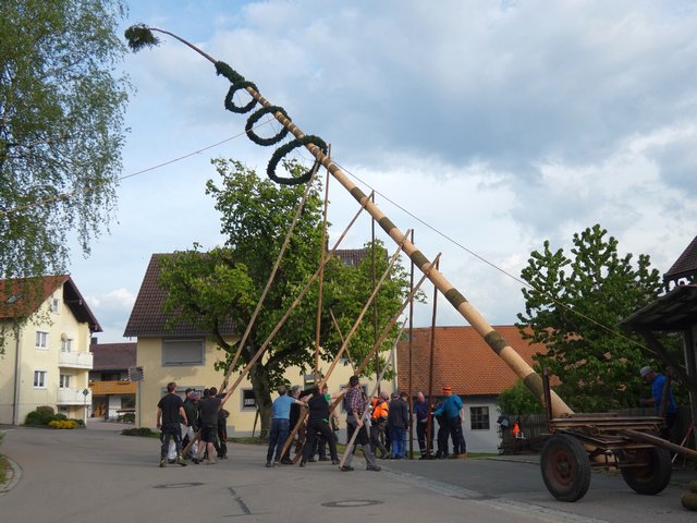Am Sonntag vor Pfingsten wird in Irlach Kirchweih gefeiert. Seit etwa 40 Jahren ist es Tradition, dass dazu ein Kirwabaum aufgestellt wird. Kurz nach Mittag trafen sich einige Mitglieder der Feuerwehr um eine geeignete Fichte zu fällen. Entsprechend hergerichtet und zu verzieren wurde sie dann auf den Dorfplatz. Vor dem Aufstellen wurden die drei Kränze angebracht und mit bunten Bändern geschmückt. Die anwesenden Feuerwehrler verteilten sich auf die Stangen, sogenannte „Soinga“. Mit Muskelkraft und Hauruck vom Kommandanten Christian Reitinger wurde dann der 31 m lange Baum, Stück für Stück in die Senkrechte gehievt. Nach dem exakten vertikalen Ausrichten, was bei dem böigen Böhmischen Wind nicht einfach war, konnte er im Schacht ordentlich verkeilt werden. Zum Schluss wurden die Zunftzeichen befestigt und die noch fehlende Jahreszahl eingeritzt.